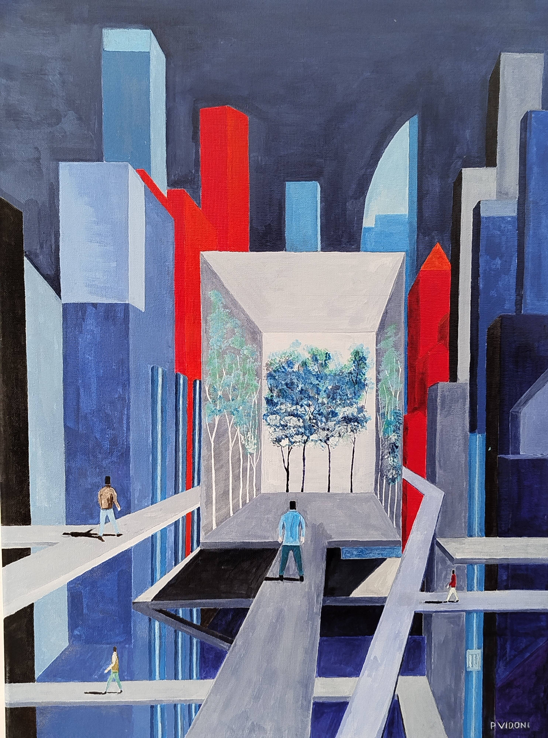 Il secondo nucleo di opere offre, invece, una visione più inquieta e critica della metamorfosi: qui la trasformazione si fa disumanizzante. L’uomo, sempre più tecnologico, si allontana dalla propria dimensione naturale, confinando la natura in spazi artificiali, dove essa può essere soltanto osservata ma non più vissuta. In queste opere, la metamorfosi non è più segno di crescita, ma di perdita: la perdita del contatto con la terra, con la materia viva e con la parte più autentica di sé.